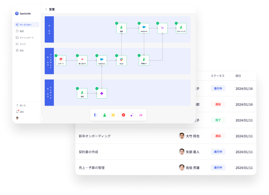 OpsGuideは、業務管理、自動化、タスク管理、システム統合等のツールを総合します。
